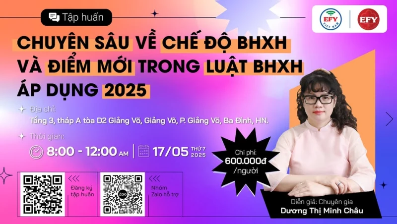 - Thất nghiệp, cách bảo lưu thời gian hưởng TCTN,... Từ đó, EFY Việt Nam tiếp tục tổ chức lớp tập huấn chuyên sâu về các quy định BHXH, BHYT, BHTN và những điểm mới trong năm 2025 để có thể giúp cho các công ty và NLĐ cập nhật kịp thời những thay đổi mới nhất.