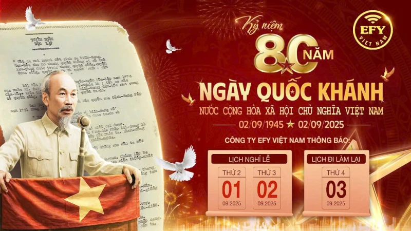 Hòa chung không khí cả nước tưng bừng kỉ niệm 80 năm ngày Quốc Khánh 2/9, EFY Việt Nam xin trân trọng thông báo lịch nghĩ lễ Quốc khánh 2/9/2025 đến Quý đối tác, Khách hàng như sau: